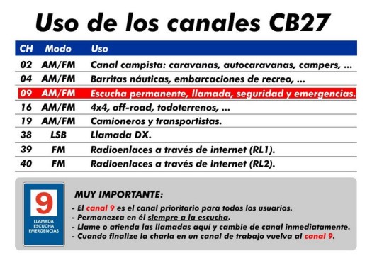 • El canal 9 de la Banda Ciudadana CB27 es de uso exclusivo para efectuar llamada, permanecer a la escucha (monitoreo o esperando una llamada) y para el tráfico de comunicaciones de emergencia.Las comunicaciones de emergencia tienen prioridad total en cualquier canal destinado al servicio de CB, tanto en el canal 9 como en cualquier otro.