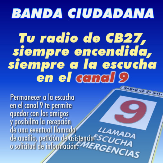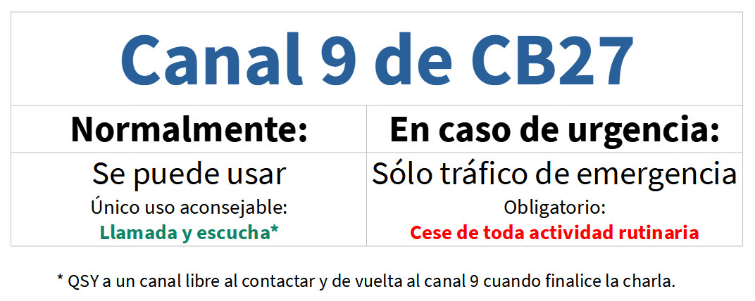 El canal 9 de la Banda Ciudadana CB27 se usa exclusivamente para efectuar llamada, permanecer a la escucha (monitoreo o esperando una llamada) y para el tráfico de comunicaciones de emergencia.