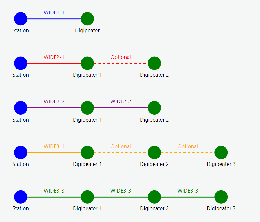 - Descripción: Esta es la trayectoria amplia más básica. El primer repetidor digital compatible que lo escuche retransmitirá su paquete sólo una vez.