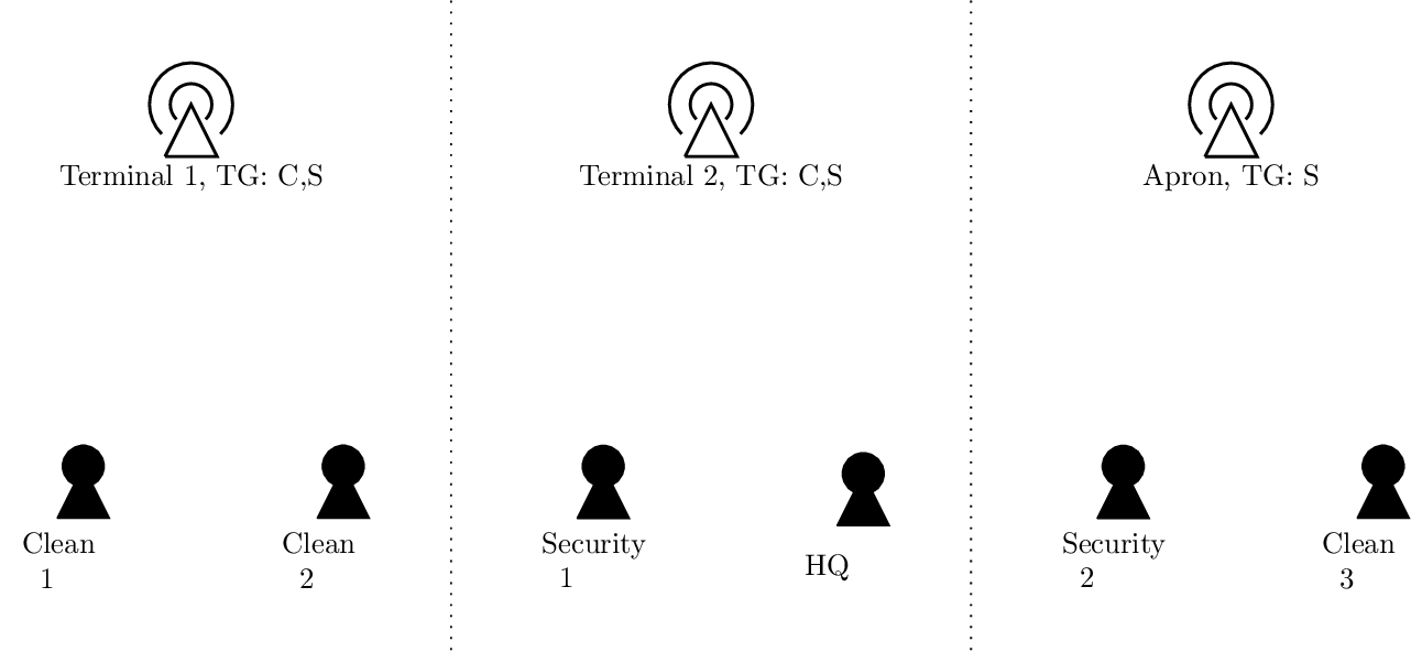 Hay tres personas de limpieza, dos de seguridad y una de dirección. Para cubrir toda la zona se necesitan tres repetidores. Uno en la Terminal 1, otro en la Terminal 2 y otro en la plataforma.