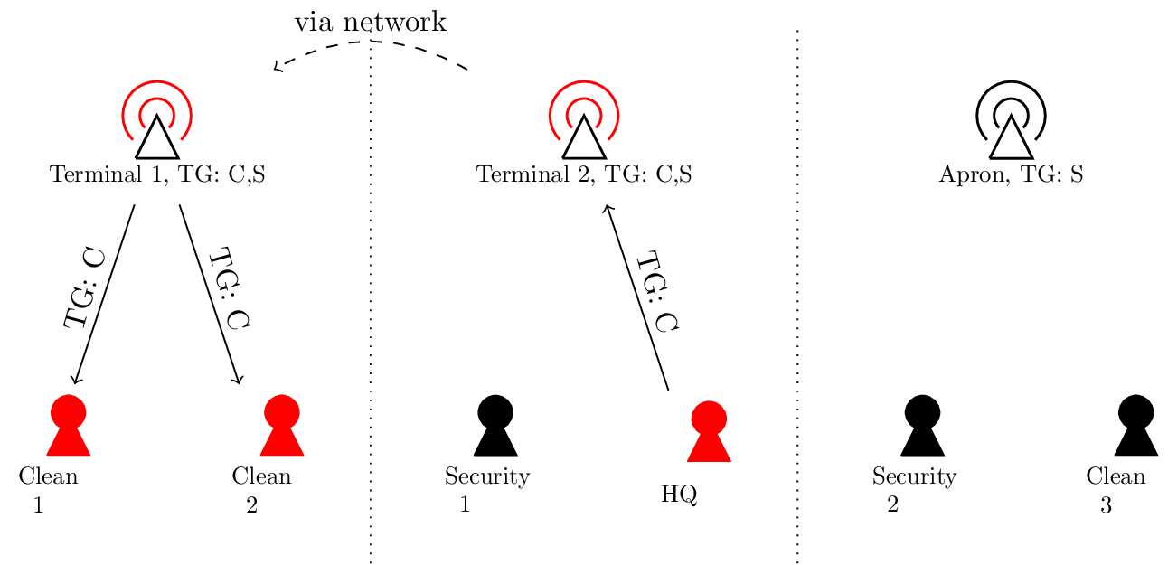 Este ejemplo muestra una red simplificada de aeropuertos (en realidad, es mucho más grande y compleja). Consideremos la situación en la que los equipos de Limpieza 1 y Limpieza 3 quieren comunicarse. Al mismo tiempo, la Dirección quiere hablar con el equipo de Seguridad 1. En una red analógica simple, la llamada entre el equipo de Limpieza 1 y Limpieza 3 bloquearía toda la red y, por tanto, la llamada entre la Dirección y el equipo de Seguridad 1.