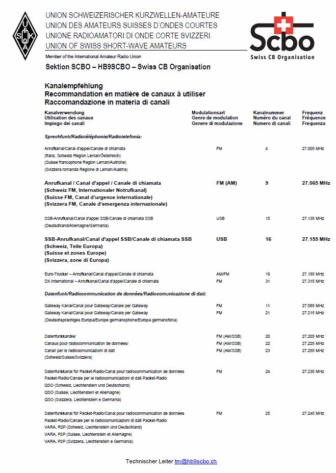 La Organización Suiza de la CB (SCBO), adscrita a la Unión de Radioaficionados Suizos de Onda Corta (USKA), establece, en su cuadro de recomendación de uso de los canales de Banda Ciudadana para el país alpino, el canal 9 como de llamada para los modos AM y FM, tal como lleva proponiendo nuestra asociación desde hace años.